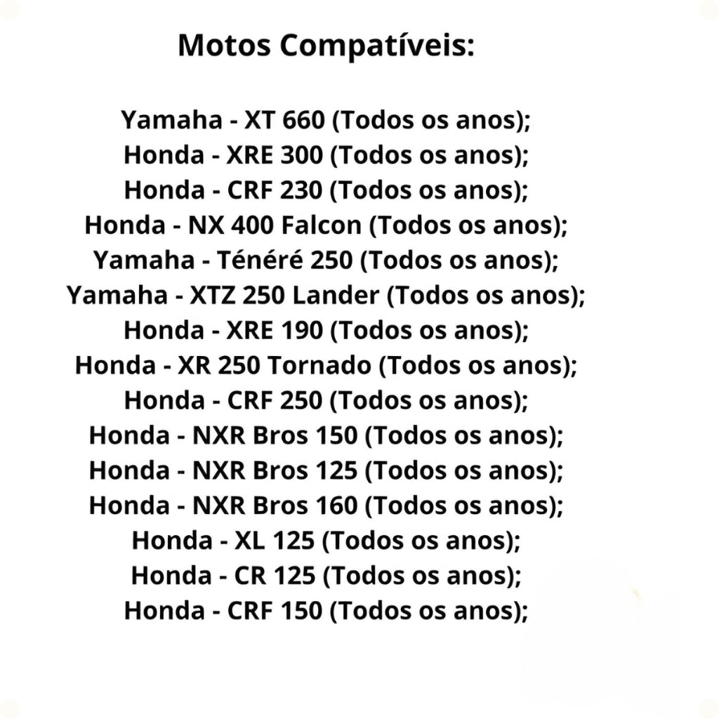 Guidão Fat Bar Esportivo Alto + Adaptador - Shopping ImportsDescrição: Nosso guidão esportivo Fat Bar Alto é ideal para quem busca alta performance e estilo, com envio em até 24 horas e garantia de 90 dias. Fabricado em alumínio CNC, possui tratamento térmico T6, o que garante máxima resistência e durabilidade. Disponível em diversas cores, como preto e dourado, é compatível com várias motos de diferentes modelos.Este guidão é projetado para motos de alta performance e inclui adaptadores, permitindo fácil instalação em diversas motos naked, off-road ou esportivas. O acabamento anodizado oferece resistência à corrosão, e a pré-marcação de corte nas pontas possibilita ajustes precisos, conforme sua necessidade.Especificações do guidão:Material: Liga de alumínio 6061-T6 de alta resistênciaAcabamento: Anodização DuraComprimento: 80 cmAltura: 10 cm a 11,5 cmDiâmetro: Extremidades de 22 mm, centro de 28 mm a 28,7 mmEspecificações do adaptador:Material: Alumínio Alcoa 6061-T6 com acabamento em eletrocoloraçãoParafusos: Aço inoxidávelAltura: 38 mmCompatibilidade: Este guidão Fat Bar é universal e pode ser instalado em uma ampla variedade de motos, incluindo:Yamaha: XT 660, XT 600, XTZ 250 Lander, XTZ 125, XTZ 150 Crosser, Ténéré 250, Ténéré 600, DT 180, DT 200, XTZ 250FHonda: XRE 300, XRE 190, Bros 125, Bros 150, Bros 160, CRF 230, CRF 250, XR 250 Tornado, NX 400 FalconOutras motos: Naked, off-road, e outros modelos que possam precisar de pequenas adaptaçõesItens Inclusos:1x Guidão Fat Bar Esportivo Alto1x Par de AdaptadoresGarantia e Envio:Garantia de 90 diasEnvio garantido em até 24 horas pela Shopping Imports