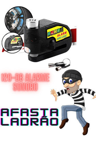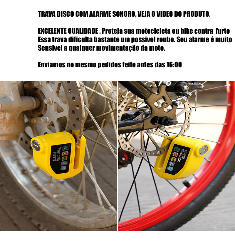 Trava Disco C/ Alarme Cadeado Antifurto Freio Moto UniversalSua trava funciona com um pino de segurança de aço de 6 milímetros que se encaixa no disco da moto.Quando o sensor detecta movimento o alarme é acionado e soará de 10 a 15 segundos antes de voltar para o modo silencioso caso não haja mais movimento detectado. O disparo se repetirá toda vez que o sensor de movimento for ativado.A trava possui corpo de aço e sua chave é codificada e a mesma serve para acionar e desligar o alarme.Trava de Disco para motos com sistema de alarmeO alarme é acionado através de um sensor de movimento interno que dispara uma sirene de 110db. Este alarme será interrompido com a abertura da trava ou rearmará automaticamente após alguns segundos. A bateria usada é AG13 ou LR44.A trava deve ser posicionada em qualquer parte do disco entre as furações, de preferência de instalar a trava na vertical, com a abertura da chave voltada para cima, para obter uma máxima performance do equipamento. Este equipamento é indicado para a prevenção furto do seu veículo, assim como sinalizador anti esquecimento afim de evitar acidentes por não remover o equipamento antes do uso de sua moto.Especificações- Sensor de movimento: A trava possui um sensor de movimento interno que detecta alterações de posição e dispara o alarme;- Liga metálica ultra resistente: Uma combinação de metais leves e muito resistentes oferecem a segurança necessária e também a facilidade de transporte da trava.Trava de disco com alarme de 110 db- COR: PRETO / AZUL / AMARELO / LARANJA / VERMELHO / GRAFITE, ENVIAMOS DE ACORDO COM A DEMANDA DE NOSSO ESTOQUE.Sensor de movimento;Compartimento de bateria resistente a água;Pino de 6 mm de diâmetroChaves codificadas exclusivas.Kit Contém:- 1 trava- 2 chaves