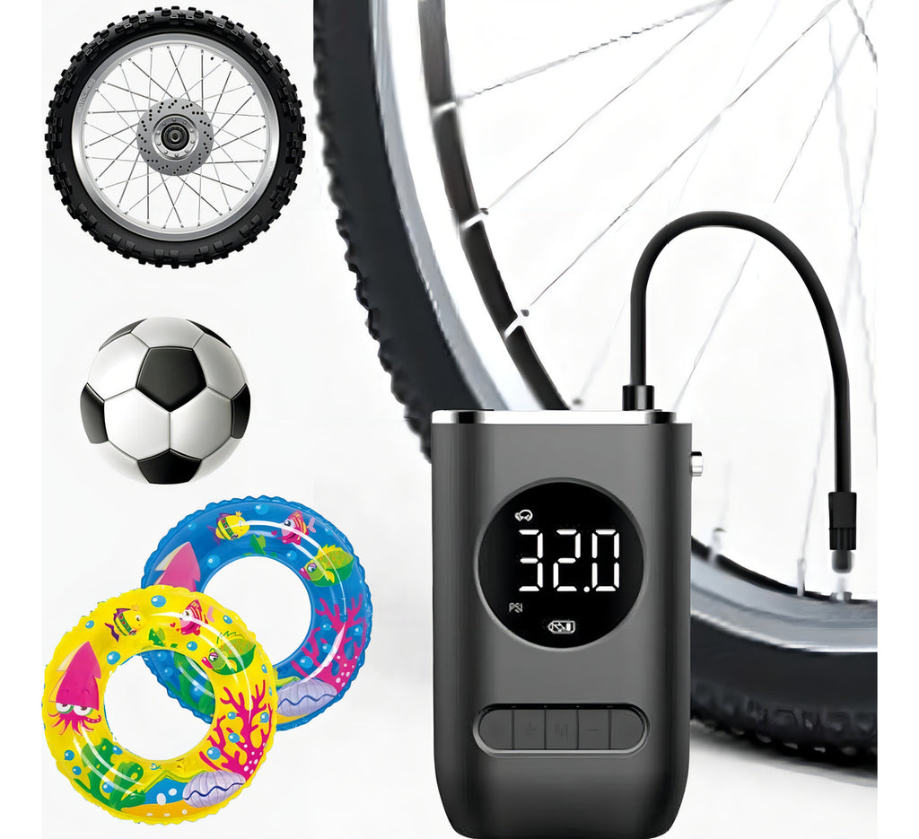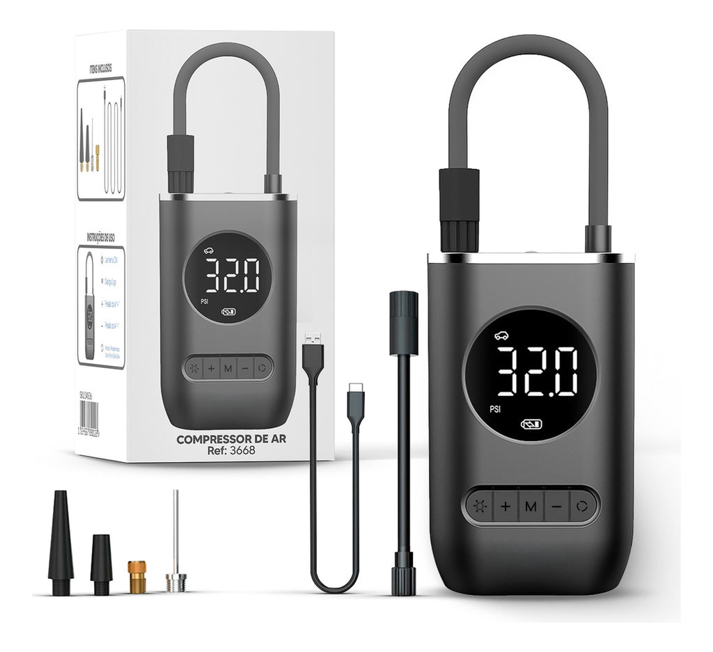 Bomba Compressor de ar portátil digital superpotente com lanterna, recarregável bivolt.Enche: Pneus de carros, motos, bicicleta, bolas etc. Produto compacto e potente, indispensável para ter em casa ou no carro. O Compressor é portátil e recarregável, conta com uma bateria de 2000 mAh com diversos modos predefinidos para carro, moto, bicicleta e bolas.Funciona em qualquer tipo de carro, moto e bicicleta.Modo de uso simples e práticoDetecta automaticamente o PSI do pneu, basta selecionar o PSI ou bar desejadoPara maior comodidade o aparelho possui lanternaINFORMAÇÕES TÉCNICAS:- Material: ABS- Atual: 10A- Potência: 120W-Capacidade de carga: 4000 mAh- Fluxo de pressão de ar: 25l/min- Tipo de fonte de alimentação: TYPE-C- Comprimento do cabo de alimentação: 0.8m- Comprimento do tubo inflável: 0.5m- Quatro modos estão disponíveis: carro, bicicleta, carro elétrico, basquete- Tamanho aproximado: 15x9.5x7.2cm- Tamanho da embalagem: 17x11x10cm- Peso da embalagem: 525g- 5V - Utilizar com fonte BivoltConteúdo da embalagem:- 1 Bomba de Ar Elétrica Portátil Recarregável + Conjunto de Bicos