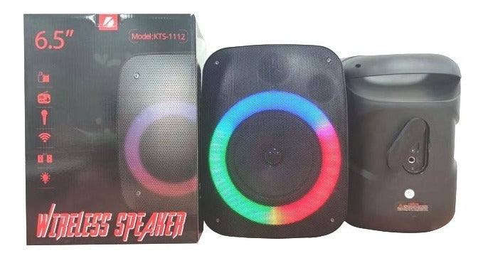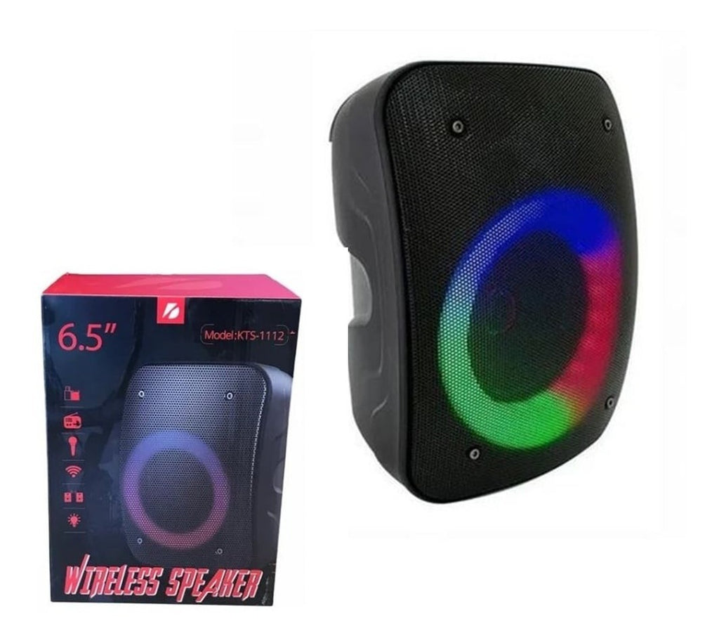 Caixa de Som RGB Wireless KTS1112 Esta caixa de som possui um extraordinário alto falante de 6.5 polegas, com função BASS para aumentar o Grave na batida mostrando toda a potência da wireless Speaker.Com Bateria de Lítio de Alta duração a música não pára.Um clique no botão MODE passe pelas opções de funções (Bluetooth, auxiliar, usb, etc) e também passando pela rádio FM. Sim, possui rádio FM, para ouvir as rádios favoritas.Com design moderno e elegante, possui luzes de led coloridas. Especificações: • Alcance sem fio: até 10 metros • Tamanho da unidade do alto-falante: 6,5 polegadas • Potencia: 20W • Capacidade da Bateria: 2400mAh • Tempo de carga: 3/4 Horas Itens Inclusos: - 01 Caixa de Som RGB Wireless Speaker C/ Suporte 6.5 - KTS-1112