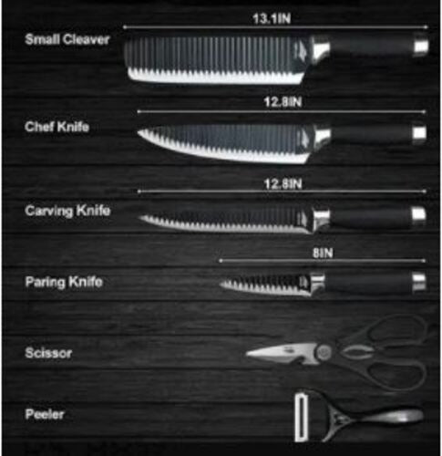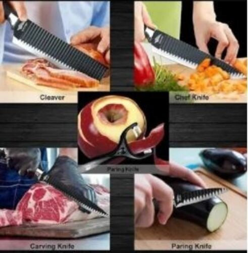 KIT FACAS PROFISSIONAIS EM AÇO NIOBIOCONJUNTO DE 6 PECAS - Chef Produto De Alta Qualidade DAILY PREMIUM GOURMET AÇO NIOBIO Para CarnesIndicada para o corte de grandes pedaços de carne crua ou assada. As ondulações na lâmina e o revestimento anti aderente evitam que os pedaços fiquem grudados na faca.Aço NIOBIOFio com excepcional resistência e durabilidade.Caixa com fecho magnético, ótimo para presentes.Cabo Soft Touch.E anti derrapanteSuper afiada- Contém 6 peças:• 1 Faca Mini Cutelo 32x5cm.• 1 Faca Do Chefe 32,3x4,5cm.• 1 Faca de Trinchar 32x3,7cm.• 1 Faca Legumes/Frutas 19,5x2,3cm.• 1 Tesoura Cozinha Com abridor de lata e quebrador de nozes 20x8,3cm.• 1 Descascador 14,7x6,3cm.- Recomendações:• Resistente ao uso em máquina de lavar.• Produto cortante e perfurante.• Mantenha fora do alcance das crianças.- Cuidados:• Lave com detergente neutro e enxague com água limpa em abundância.• Para secar, utilize um pano seco e macio.• Evite o uso de produtos abrasivos.