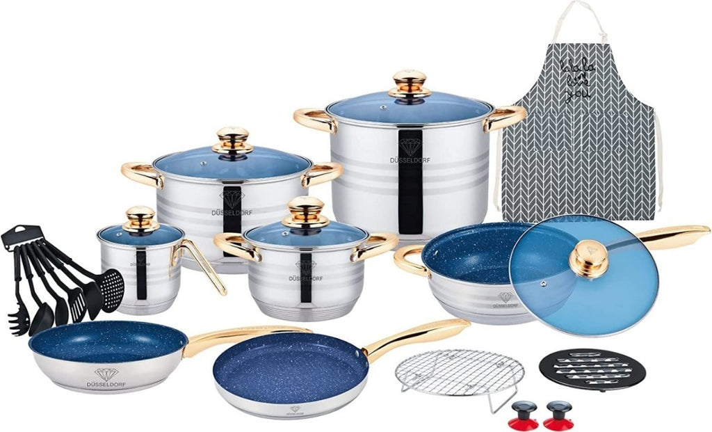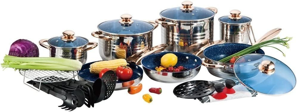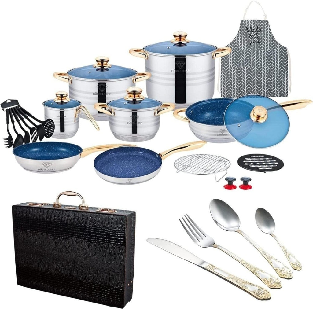 ATENÇÃO ANTES DE USAR FAVOR CURA A PANELA ANTIADERENTE SEGUE LINK DE COMO FAZER NO YOUTUBE ; https://www.youtube.com/shorts/QsOBFUc-_ncJOGO DE PANELAS ANTIADERENTE + FAQUEIRO 84 PEÇAS conjunto de panelas e frigideiras conjuntos de panelas e frigideiras para casamentoregistro por vasos de pesquisa de nomes de noivasConjunto de panelas de cozinha panelas conjunto de panelas de alcaravia conjunto de panelas e frigideiras antiaderente conjunto de panelas antiaderenteLAVA-LOUÇA: O conjunto de talheres tem alto nível de fabricação, todos os itens são resistentes e ergonômicos ao mesmo tempo, combina muito bem com diversos tipos para deixar jantares e ocasiões especiais marcados na memória! Feito de material de aço inoxidável de alta qualidade, resistente, durável e brilhante.USOS MÚLTIPLOS: Este conjunto de talheres banhados a ouro pode ser usado não apenas para uso diário, mas também para reuniões de família e amigos, casamentos, restaurantes, hotéis, cafés, camping, etc. utensílios de servir, é feito de aço inoxidável premium, antiferrugem e anticorrosão, saudável para o uso diário.23 PEÇAS9 CAMADAS DE CERÂMICAAÇO CIRÚRGICO 18/10 GRAMATURA TERMOSTATO01 - 1 CAÇAROLA 6.5 LITROS MEDINDO 24CMX14CM COM TAMPA02 - 1 CAÇAROLA 3.0 LITROS MEDINDO 20CMX10CM COM TAMPA03 - 1 CAÇAROLA 1.6 LITROS MEDINDO 16CMX08CM COM TAMPA04 - 1 FRIGIDEIRA 3.0 LITROS MEDINDO 24CMX6.5CM COM TAMPA05 - 1 PANELA 1.6 LITROS MEDINDO 16CMX09CM COM TAMPA06 - 1 PANELA VAPORIZADORA MEDINDO 20CMX10CM07 - 1 FRITADEIRA MEDINDO 18CMFAQUEIRO 84 PEÇAS - Faqueiro 84Peças em Aço Inoxidável 18/10 3.0mm de espessuracom filetes banhando a ouro 24k, design exclusivo e sofisticado.- Faqueiro leva charme, elegância e bom gosto para a composição da sua mesa.- Um faqueiro clássico produzido em aço cirúrgico,- Ricamente adornado e exclusivo.- Todas as peças são produzidas em aço inoxidável. Apresentam espessura de 3mm e acabamento espelhado.- Caixa produzida em couro sintético, estilo maleta reforçada com fechamento em sistema de código.Inclui12 Colheres12 Garfos principais12 Facas principais12 colheres chá/sobremesa12 Garfos sobremesa12 Colheres sobremesa12 colheres café01 Espátula pata bolo02 Garfos peixe01 Concha grande01 Concha pequena01 Colher açucareiro01 Pegador02 Colheres para servir02 Colheres de salada01 MaletaMAIS, 11 UTENSÍLIOS PARA COZINHA08 - 01 BAKELITE ( SUPORTE DE PANELAS)09 – 01 CONJUNTO DE UTENSÍLIOS NYLON (6 PEÇAS)10 - 02 BOTÃO SUCÇÃO11 - 01 AVENTAL DE BRINDEPESO: 11.2KG.
