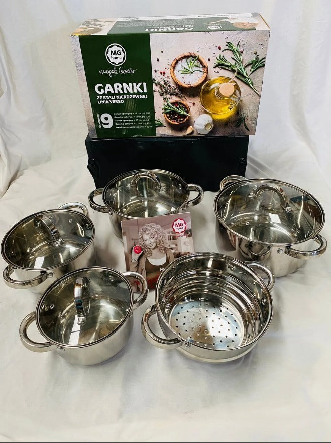 AÇO INOXIDÁVELLINHA VERSAUma linha de potes da série MG home feitos com a mais alta qualidadeaço inoxidável. O aço utilizado consiste em liga da melhor qualidade,que garante resistência à corrosão e durabilidade. tem altapropriedades térmicas que reduzem o tempo de cozimento e por um longo períodomantenha morno. Inserção de vapor incluída.Um fundo grosso com uma camada de alumínio evita queimaduras e aderênciaferir pratos. As loiças são equipadas com modernos e práticose alças sem aquecimento que sempre permanecem frias.As panelas desta série podem ser utilizadas em todos os tipos de fogões.A ESCOLHA PERFEITAPARA PESSOAS COM ALERGIAMedidascapacidadeEspessofundo multicamadasSeguroalçasAÇO INOXIDÁVELLINHA VERSAPote com tampa 16 cm, capacidade 1.81Pote com tampa 18 cm, capacidade 2.51Pote com tampa 20 cm, capacidade 3.31Pote com tampa 22 cm, capacidade 4.51Inserção de vapor Ø 20 cmELEMENTOSManual do usuárioLeia todo o manual de instruções antes de usar a panela pela primeira vez. Guarde o manual e guarde-o facilmentelugar disponível. Para facilitar o uso das alças por outros usuários em potencial, guarde a embalagem e as instruçõesserviço.Para garantir uma cooperação adequada entre o fogão e a placa, siga as orientações contidas no manual de instruçõesfabricantes de placas. A seleção correta do diâmetro da panela para o tamanho da zona de aquecimento evitará que a panela superaqueça e perca energia.3. Com base em pd. 1 das instruções, use fontes de calor apropriadas.Não aqueça uma panela vazia no fogão. Antes de aquecer a panela, encha-a com água, óleo, gordurasO calor deve ser aumentado gradualmente para evitar choque térmico. No caso de fogão a gás, a chama deve estar presentecolocados sob a alça e não se estendem além da base. ATENÇÃO! Ao usar um fogão de indução, ele renasceiniciando o processo de aquecimento a partir da potência mais alta, a chamada Funkqi Booster, pode expor o jogo a danosNão coloque um prato frio na placa, por exemplo, previamente retirado do frigorífico. Por sua vez, o prato quente enão mergulhe a tampa nem a encha com água fria, pois pode deformar o fundo ou danificar a tampa.Uma panela com deformação significativa deve ser retirada de serviço6.Não deixe o líquido ferver completamente para fora da gaze.Para lavar a panela e a tampa, deixe-os esfriar à temperatura ambiente antesRecomenda-se proteger o gamek e a tampa contra arranhões, hematomas e impactosNão corte ou divida alimentos no pratoAo preparar alimentos, use acessórios feitos de materiais que não risquem a superfícieO prato não deve queimar15Recomenda-se reduzir a potência do forno ao levar os alimentos à fervura, para poupar energia.A panela e a tampa ficam quentes durante o uso.ATENÇÃO! Use luvas de proteção ao tocar nas alças e tampas17.Ao retirar o tacho da placa de indução, recomenda-se levantá-lo para evitar riscar a placaNão coloque panelas em um fogão sujo18. Durante o cozimento ou lavagem, manchas brancas ou pretas podem se depositar nas paredes, são substâncias minerais.O fenômeno natural das manchas resultantes pode ser removido usando água com suco de limão ou vinagre de vinho.Adicione sal de cozinha depois que a comida ferver. Este comportamento evitará o aparecimento de corrosão e depósitos brancos.As panelas de aço inoxidável não se destinam ao armazenamento de alimentos e não devem ser usadasIsto é especialmente verdadeiro para alimentos ácidos e secosNão use a panela no micro-ondas e no forno22 Tenha cuidado para manter as panelas quentes fora do alcance das crianças.ManutençãoAo usá-lo pela primeira vez, lave o gamek em água morna com a adição de detergente líquido.Em seguida, ferva a água na panela 3 vezes e despeje.Após cada cozimento, o recipiente deve ser resfriado e lavado em água morna com detergenteInstruções para sujeira pesada e queimadurasCarregue gamek com água morna e detergente, deixe por um longo tempoSe a sujeira ainda grudar, você pode aquecer a água com o líquido até ferver, retire os restos com uma ajudaferramenta de cozinha.Após a lavagem, seque o gamek com um pano5 Não é recomendado o uso de esfregões com estrutura pontiaguda para limpeza.Não use detergentes fortes com propriedades cáusticas e de branqueamento para limpezaArmazenarColoque as apostas fora do alcance das crianças.Armazene de forma que a superfície do tapete não entre em contato com outros pratosPara guardar pratos colocados dentro de outros, recomenda-se o uso de um translatorem forma de pano ou papel toalha.