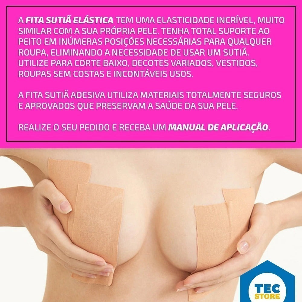 Sutiã Adesivo - Modelo Fita de Sustentação (ORIGINAL)Embalagem contém:- 02 Rolo com 5 Metros da Fita Sutiã Adesiva para levantar os seios (protetores de mamilos não inclusos)- Manual de como aplicarDimensões da Fita:5 Metros (comprimento) por 6 Centímetros (largura)MODO DE USAR:Limpe e seque bem os seios, não use perfumes, cremes, desodorantes e óleos, a pele tem que ficar bem sequinha!BENEFÍCIOS:- Levanta os seios, deixando-os com aspecto natural e bonito- Resistente ao suor e aprova d'água- Muito confortável e práticoATENÇÃO!!!Siga todas as orientações para a sua segurança:1 - Evite aplicar em cima de ferimentos ou de pele inflamada, não use sobre a pele irritada ou queimada do sol.2 - Não utilize mais de 10 horas (seguidas) para cada aplicação caso a pele esteja transpirando muito.3 - Antes da utilização, lavar bem a pele com sabonete, seque muito bem e não faça a aplicação de cremes ou hidrantes para o corpo (na região de uso da Fita Adesiva), isso irá prejudicar a aderência do adesivo.4 - Para retirar, puxe suavemente utilizando água e sabonete de sua preferência.Este produto está em estoque para envio imediato. Realize o seu pedido e receba com rapidez. Estaremos a sua disposição para retirar qualquer dúvida.