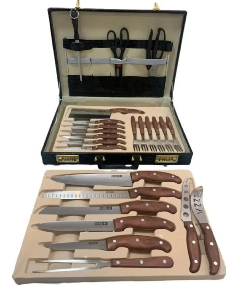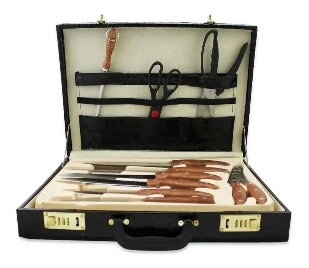 Kit Churrasco ou Cozinha Com Maleta 25 Peças Em Aço InoxPara ser um bom cozinheiro, você precisa não apenas de boas idéias, mas também de boas instalações ...Se você sempre teve uma fraqueza por boa comida, esta é a ferramenta perfeita para missões culinárias de sucesso todos os dias.Esta bolsa contém uma infinidade de facas, picador, apontador e outros acessórios para várias refeições e alimentos para que você possa cozinhar como um chef em qualquer circunstância.Tudo o que você precisa agora é inovar para preparar verdadeiras iguarias e compartilhá-las com seus entes queridos.Conjunto inclui:- Faca Chef 24cm- Faca de Pão 20cm- Faca de Carne 22cm- Cleaver 16 cm- Faca Universal 23cm- Suporte de Forquilha 16cm- Afiador 19cm- Faca Entalhada 14cm- Faca de Emparelhamento 10 cm- Facas de Carne (6 peças)- Garfos (6 peças)- Tesoura de frango- Tesouras- Faca de Queijo- Faca de Pizza- Mala com trava de código