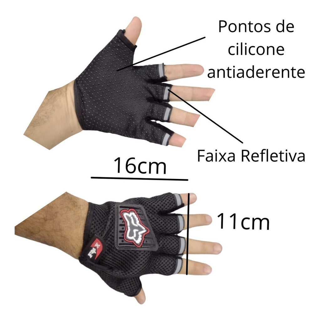 ******************** Luva Bike Meio dedo ********************************Luva com o melhor custo benefício.Proteja suas mãos com um precinho camarada. Protegendo suas mãos no dia a dia, fique longe das mãos grossas com o uso diário em bikes e motos.Antiderrapante com silicone. Faixas refletivas que ajudam na sinalização no trânsito refletindo ao encontro de luzes e faróis.Regulador de largura e logomarca bordada em silicone rígido.