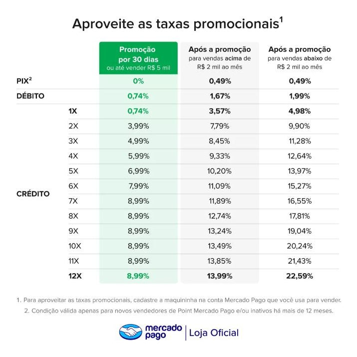 Point Pro3: Maquininha de Cartão 4G com Tela Touch | Fácil de Usar | com Taxas Promocionais-Taxas Promocionais* por tempo limitado a partir de 0,74% no débito!-Quanto mais você vende, menores podem ser suas taxas.- Seu dinheiro disponível na hora, sem aluguel e sem taxa de adesão. -Aceite pagamentos por aproximação, voucher, cartão com chip e tarja magnética, código QR e Pix.-Venda de qualquer lugar com Wi-Fi e chip 4G grátis e plano de dados ilimitado.-Tela (4”) touch screen com maior qualidade e definição.- Administre suas vendas com facilidade pela maquininha.- Imprima comprovantes e tenha reposição de bobinas grátis.-Crie sua conta digital pessoal ou empresarial grátis e sem burocracia.-Tenha mais de uma maquininha usando a mesma conta.-Tenha 3 anos de garantia e troca grátis.=============================================**Confira as taxas promocionais:**Você tem as taxas mais baixas do Mercado Pago durante os primeiros 30 dias ou até vender R$ 5 mil reais no mês (o que ocorrer primeiro). Após passar esse período ou quando atingir o valor em vendas, as taxas serão ajustadas de acordo com o seu faturamento mensal.Para vendas no débito e crédito à vista: dinheiro disponível na hora por 0,74%.Para vendas parceladas:- 2x: 3,99%- 3x: 4,99%- 4x: 5,99%- 5x: 6,99%- 6x: 7,99%- 7x: 8,99%- 8x: 8,99%- 9x: 8,99%- 10x: 8,99%- 11x: 8,99%- 12x: 8,99%Para vendas no Pix: 0,00%Você pode repassar os acréscimos por parcelar para o comprador no momento da venda, direto na maquininha ou pelo app.Condições apenas para novos vendedores de Mercado Pago ou vendedores inativos há mais de 12 meses. Consulte o regulamento para maiores informações.=============================================**Confira as taxas após o período promocional para vendas acima de R$ 2 mil ao mês:**Para vendas no débito: dinheiro disponível na hora por 1,67%.Para vendas no crédito à vista: dinheiro disponível na hora por 3,57%.Para vendas parceladas:- 2x: 7,79%- 3x: 8,45%- 4x: 9,33%- 5x: 10,20%- 6x: 11,09%- 7x: 11,89%- 8x: 12,74%- 9x: 13,24%- 10x: 13,49%- 11x: 13,85%- 12x: 13,99%Para vendas no Pix: 0,49%Essas taxas são válidas para faturamentos a partir de R$ 2 mil reais no mês.Caso o valor em vendas seja menor serão aplicadas taxas padrão.Quanto mais você vende com a Point, menores são suas taxas, confira as taxas para quem fatura acima de 5 mil reais no mês. Imperdível!Condições apenas para novos vendedores de Mercado Pago ou vendedores inativos há mais de 12 meses. Consulte o regulamento para maiores informações.=============================================**Conectividade e Praticidade:**- Conexão Wi-Fi de 5GHz e chip 4G já instalado para começar a vender imediatamente.- Plano de dados ilimitado e sem custo, não precisa do celular para vender.- Chip: Vivo, Claro ou Tim, você escolhe a operadora que preferir.=============================================**Aceite várias formas de pagamentos:**- Principais Bandeiras: Visa, Mastercard, American Express, Elo, Hipercard, Hiper, Cabal.- Vouchers de alimentação e refeição: Sodexo, Alelo, VR Benefícios e Ticket (exclusivo para CNPJ do ramo).- Opção de gerar Código QR para Pix na maquininha.- Pagamentos por aproximação (NFC), carteiras digitais (Apple Pay e Samsung Pay) e inserção do cartão com chip e tarja.=============================================**Confira o que você receberá com a Point Pro 3:**- 1 Point Pro 3 (chip já instalado e bateria de longa duração).- 1 fonte de carregador com cabo.- 1 manual de instruções.- Adesivos para ponto de venda com os principais meios de pagamento.- 4 bobinas (sendo 1 na maquininha e 3 bobinas na caixa)Você poderá pedir mais bobinas grátis pelo app do Mercado Pago, acessando a sua conta.***NÃO ACOMPANHA BASE DE CARREGAMENTO, APENAS CARREGADOR COM FIO E FONTE DE ENERGIA***=============================================**Como configurar a sua maquininha:**-Basta cadastrar sua nova Point no app do Mercado Pago, acessando a sua conta digital.-É possível ter mais de uma maquininha em uma mesma conta.=============================================**Receba o valor das suas vendas na conta Mercado Pago:**-Tenha a conta digital gratuita do Mercado Pago, o banco parceiro do Mercado Livre.-Peça grátis o cartão Mercado Pago pelo app e aproveite os benefícios do Mercado Pontos.-Acompanhe as suas vendas e gerencie os seus negócios de forma eficiente pelo app.=============================================**Como abrir sua conta no Mercado Pago:**1-Baixe grátis o app do Mercado Pago na sua loja de aplicativos.2-Crie sua conta, informando seu e-mail, CPF ou CNPJ e telefone.=============================================**Tire as suas dúvidas em qualquer momento:**Se você já comprou a Point e possui alguma dúvida, acesse o app do Mercado Livre, na área Minhas Compras, na opção Fale com o vendedor, e entre em contato com a genteConfiras os termos e condições do Plano Promocional Mais Venda, Menos Taxa:https://www.mercadolivre.com.br/loja/mercado-pago/faq-e-regulamento