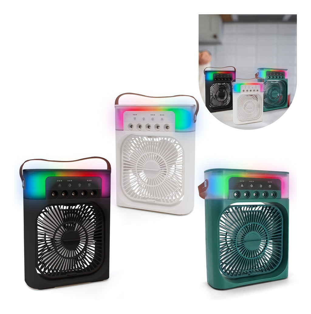 O mini climatizador portátil possui três níveis de refrigeração: refresque o ambiente por meio da evaporação da água, ajustando entre três diferentes velocidades para garantir o máximo conforto.Programação Conveniente: Explore três opções de temporização automática (1H/2H/3H) para otimizar seu lazer, sono ou horas de trabalho conforme a sua conveniência.Mobilidade Prática: Com um design de alça, este resfriador evaporativo portátil é fácil de transportar para qualquer lugar que você deseje.Direcionamento Personalizado: Ajuste manualmente a direção do fluxo de ar em até 60 graus, criando sua própria área de resfriamento personalizada.Reservatório Removível: Simplifica a limpeza do reservatório de água e possibilita a adição de cubos de gelo para um resfriamento extra.Iluminação Ambiente: Desfrute de sete cores de LED que podem ser escolhidas de acordo com sua preferência, incluindo um modo suave de transição de cores. Além disso, use-o como uma luz noturna suave que não perturba o sono, com a opção de desligar para quem é sensível à luz.Eficiência Silenciosa e Energética: O funcionamento ultra silencioso do ventilador não causa desconforto durante suas atividades diárias ou sono, enquanto sua eficiência energética faz dele uma escolha eco-friendly.Fácil Utilização: Basta adicionar água ao reservatório de 600 ml e, se desejar, alguns cubos de gelo para uma renovação extra do ambiente.Itens Incluídos na Embalagem:1 Unidade de Ar-condicionado Portátil1 Cabo USB (Adaptador de energia não incluso)1 Manual do UsuárioA corrente de saída do equipamento de fonte de alimentação deve ser maior ou igual a 2a, caso contrário, o produto não funcionará normalmente devido à fonte de alimentação insuficiente. A saída de corrente da interface USB de laptops, hosts de computador e plugues de carregamento é inferior a 2A, isso causará fornecimento insuficiente de energia e desligamento.