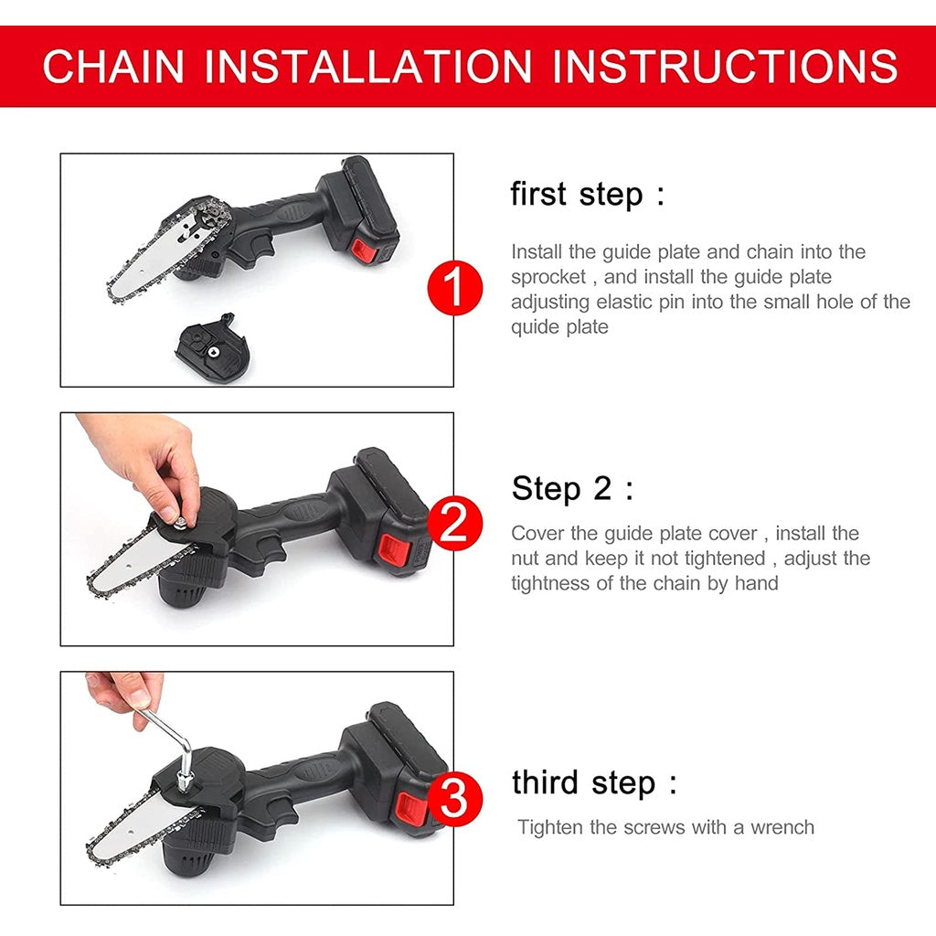 Motosserra elétrica recarregável e portátil,4 horas de vida útil da bateria super longa, sem danos à casca, 400w Bateria 24vCorpo leve, leve e conveniente, design leve, muito tempo segurando, e não as mãos cansadas.Motor de cobre puro, forte poder, corte rápido, melhora a eficiência.Prático, velocidade rápida, Baixo consumo de energia.Seletor de qualidade fina, ajuste rápido e lento, mudança de velocidade sem etapas.A placa de controle de circuito inteligente, proteção contra sobrecarga, para atender às suas diferentes necessidades de construção.A melhor motosserra portátil para jardinagem!O podador de jardim com bateria (duração de mais de 2 horas seguidas de uso) é uma ferramenta versátil com uma ampla gama de utilizações.A motosserra portátil é perfeita para podar árvores ou arbustos, cortar resíduos de jardim e projetos de bricolagem ou construir com madeira.Placa guia especial, esfera de aço de tungstênio não precisa ser lubrificado, de modo que a máquina reduza a resistência durante a operação e reduz o desgaste da máquina.O tamanho mini pode ser segurado com uma mão, sendo prática, leve e de fácil usoCorrente de placa guia de alta qualidade, têmpera profunda, mais resistente ao desgaste, corte suave.Lista da embalagem2 x bateria1 x carregador1 x Manual do Usuário1 x Máquina de corte elétrica - Motosserra Portátil