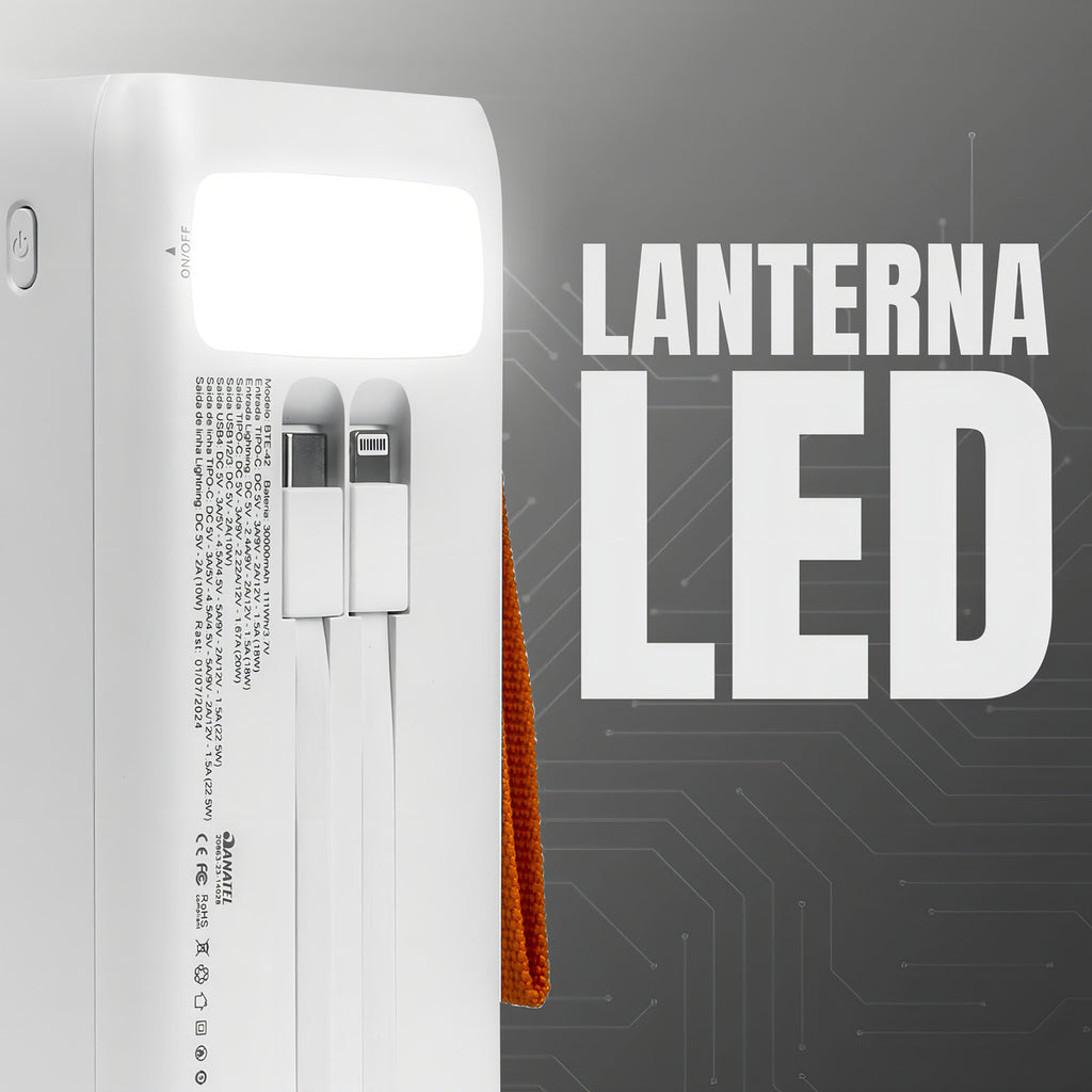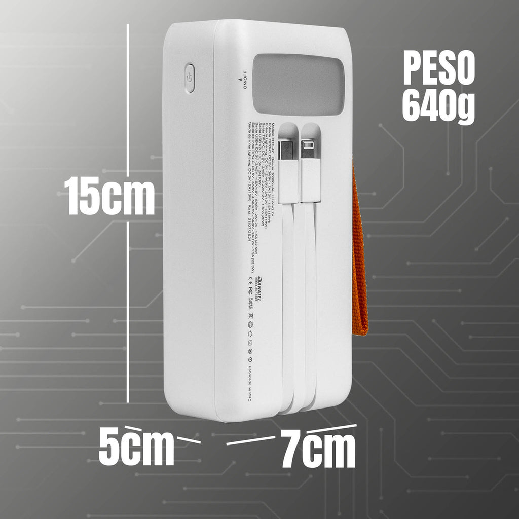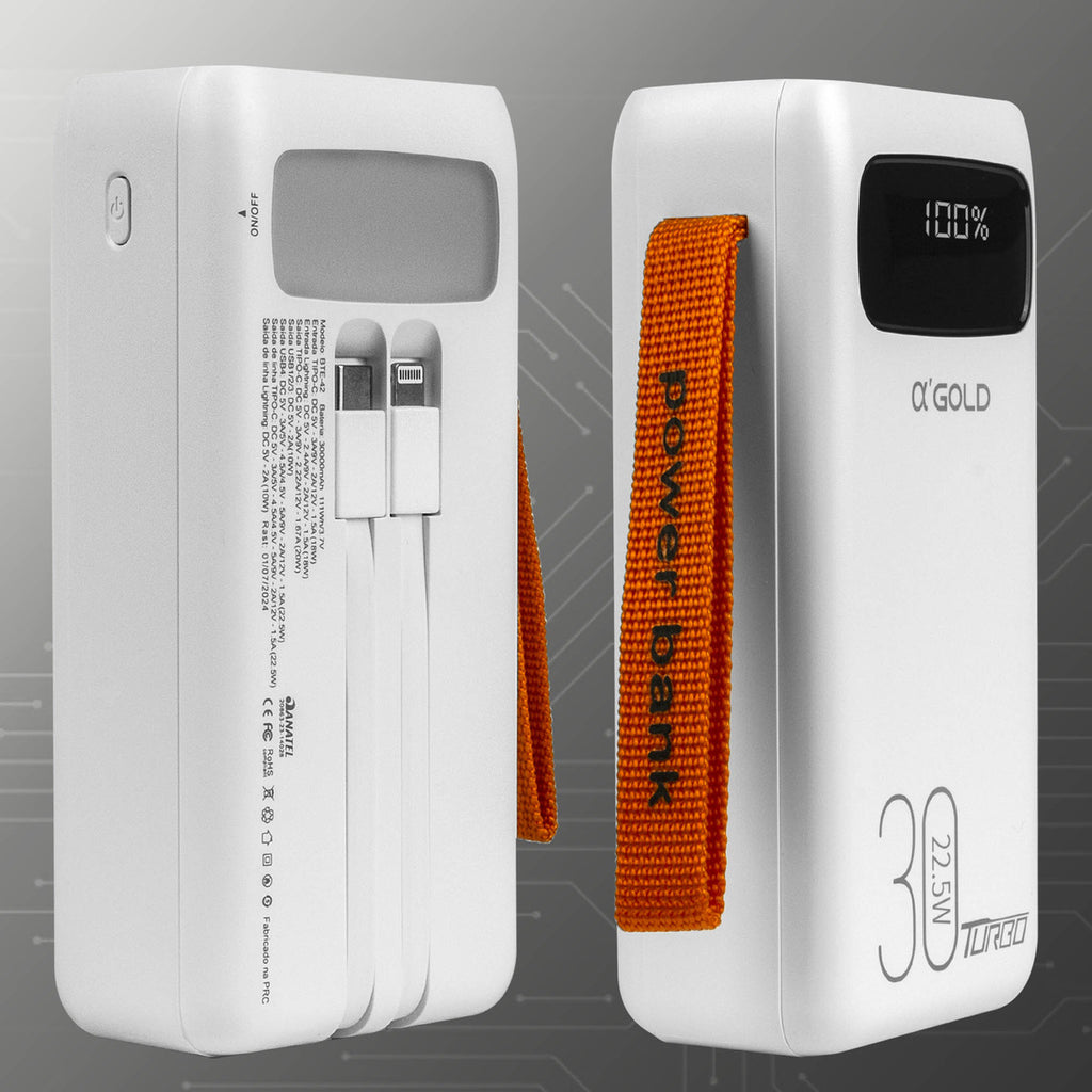 Transforme Sua Experiência de Carregamento com o Power Bank Turbo de 30.000mAh!Prepare-se para uma nova era de conveniência e eficiência com o Power Bank Turbo de 30.000mAh, disponível nas elegantes opções de preto e branco.Este power bank é mais do que uma simples bateria portátil; é uma fonte de energia robusta e inteligente que atende a todas as suas necessidades de carregamento. Com capacidade generosa e múltiplas opções de entrada e saída, ele garante que seus dispositivos permaneçam sempre carregados e prontos para uso.Seu design inovador inclui dois cabos embutidos, Tipo-C e Lightning, eliminando a necessidade de cabos adicionais e tornando-o extremamente prático para o dia a dia. A tecnologia de polímero de íon de lítio e o controle inteligente de carga e descarga asseguram uma performance superior e segura. Além disso, com suas saídas rápidas e suas proteções duplas, você pode confiar no Power Bank Turbo para oferecer energia confiável a qualquer momento.Com o Power Bank Turbo, você nunca mais ficará sem energia. Ideal para quem busca potência, versatilidade e praticidade em um único dispositivo.#CARACTERÍSTICAS#Design Elegante e Funcional: Disponível em preto e branco, com dois cabos embutidos (Tipo-C e Lightning) para conveniência máxima. Capacidade Imensa: Bateria de 30.000mAh para carregar seus dispositivos múltiplas vezes. Controle Inteligente: Unidade de mini controle (MCU) para uma gestão inteligente da carga e descarga. Proteções Duplas: Equipado com proteções de hardware e software para uma segurança adicional. Interruptor Vibratório Embutido: Ative a bateria agitando-a ligeiramente. Indicadores de Energia: Quatro LEDs que mostram a carga restante com precisão. #ESPECIFICAÇÕES TÉCNICAS#Bateria: 30.000mAh, 111Wh/3.7V Entrada Tipo-C: DC 5V-3A/9V-2A/12V-1.5A (18W) Entrada Lightning: DC 5V-2.4A/9V-2A/12V-1.5A (18W) Saída Tipo-C: DC 5V-3A/9V-2.22A/12V-1.67A (20W) Saídas USB1/2/3: DC 5V-2A (10W) Saída USB4: DC 5V-3A/5V-4.5A/4.5V-5A/9V-2A/12V-1.5A (22.5W) Saída Linha Tipo-C: DC 5V-3A/5V-4.5A/4.5V-5A/9V-2A/12V-1.5A (22.5W) Saída Linha Lightning: DC 5V-2A (10W) Homologação: Certificado conforme as normas brasileiras. #CONTEÚDO DA EMBALAGEM#1 Power Bank Turbo de 30.000mAh Cabo de carregamento *Fonte não inclusa.