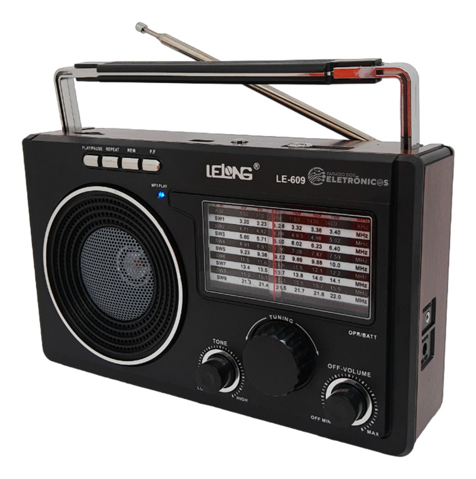 Rádio Retro Recarregável Bluetooth AM/FM/SW 1-9 SD USB MP3 Bivolt Com 11 Bandas Entrada Pendrive Cartão de Memória LE609INFORMAÇÕES DO PRODUTO:Esse rádio é retro de alta qualidade, com excelente acabamento. Possui recursos de recepção de rádio AM/FM.Pode ser conectado diretamente na tomada 110/220v, ou pode ser utilizado sem fio, com baterias internas recarregáveis. Além de poder conectar com o Bluetooth com um som alto e limpo.INFORMAÇÕES TÉCNICAS:Marca: Lelong / Modelo: LE609Material: Plástico e MetalPotência: 8WVoltagem: 110/220vBluetooth: SimRádio com 11 BandasBotão reset Luz indicadora Display analógico Botão play e pause Leitor cartão de Sd Botão controle de volumes Radio FM analógico estéreo Bateria interna recarregável Reproduz MP3 com entrada USB para pen driveEntrada auxiliar para Mp4, celular e computadorFrequência: AM 530- 1600KHz Frequência: FM 88-108MHzFrequência: SW1-9: 3.2.-22.0MHZConexão: USB/SD/TFEntrada USB (Pendrive): SimAlça de transporte: SimCaixa de som Multimídia portátil com radio AM/FM/SW Entrada USB, Cartão SD, Auxiliar.Alimentação: Cabo de força, baterias 3.7v internas recarregáveis, ou 4 Pilhas D (não inclusas)Tamanho do produto: 26cm x 15,5cm x 8cmTamanho do cabo: 1,50 MetrosPeso: 0,980gCONTEÚDO DA EMBALAGEM:1 Rádio retro Recarregável LE6091 Cabo de alimentação1 Caixa/embalagemCuidados: Evitar quedas ou pancadas que possam danificar ou desregular o funcionamento do produto. Não utilizar produto químico ou material abrasivo sobre a estampa.