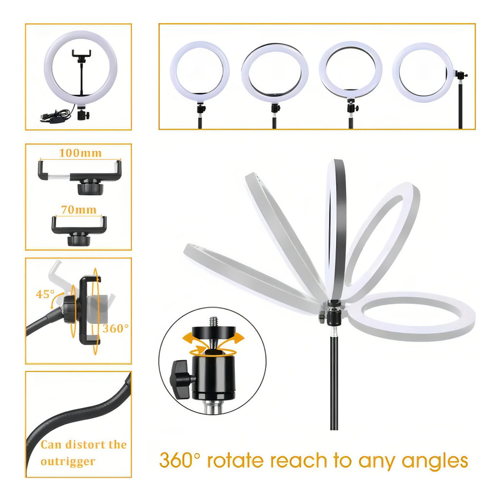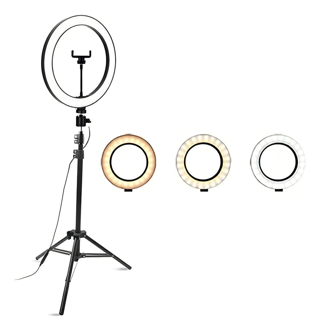 Ring light para gravações e selfies. Suas fotos e vídeos com qualidade profissional!A Ring light 26CM / 10 polegadas polegadas possuí controle integrado ao próprio cabo USB que regula os tons de cores da luz (são 3 tons. amarelo, branco frio e branco com amarelo).A Ring light possuí uma haste flexível (suporte de celular) ao meio do LED para prender o celular, proporcionando conforto para bater suas fotos e vídeo tanto verticalmente, horizontalmente, pra cima ou para baixo, por ser flexível você pode deixar na posição desejada!Além de um excelente Ring Light você também vai ter um tripé Profissional com altura máxima de 2,10m e minima de 65 cm*ATENÇÃO*A RING LIGHT SEGUE ACOMPANHADA DE:1- tripé com altura máxima de 2,10m e mínima de 65 cm1- aro circular Ring light 26Cm1- haste flexível1- fio USB1- controle de tom da luz integrada ao próprio fio USBATENCAO:- Ring light funciona por corrente direta ( precisa conectar a tomada para funcionar)-Ring light acompanha cabo usb NÃO acompanha carregador/tomada-Use um carregador/fonte de celular com porta USB unico de 5v=2.1A não use fontes com carregamentos rápido SIGA as especificações indicadas para garantir o bom funcionamento e duração do led ATENÇÃO * fontes de samsung ou apple NÃO use, sao as fontes que mais tentam usar e NÃO possui as indicações recomendadas!