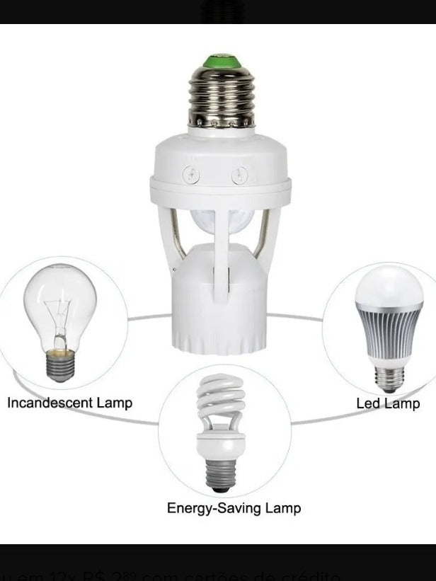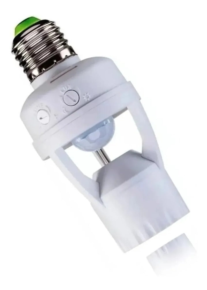 Sensor De Presença Com Fotocélula Para Lâmpada Soquete E27Sensor Presença C/ Fotocélula P/ Lâmpada Soquete E27Economize tempo e energia ao instalar este sensor de presença com acionamento automático e o seu desligamento ocorre após determinado período sem novas detecções!Além de prático e fácil de instalar, este sensor garante maior economia de energia pois seu desarmamento automático impede gastos desnecessários de maneira eficaz e simples!Ficha Técnica:Comporta lâmpadas de soquete E27;Economia de energia garantida de até 80%;Temperatura de trabalho: -10 ºC a 50 ºC;Regulagem de tempo: 30, 60, 120, 240 ou 300 segundos;Regulagem de sensibilidade: baixa, média ou alta;Cobertura de 328º;Alcance de 03 metros;Possui LED indicador de funcionamento que pisca a cada 0,5 segundos por detecção;Voltagem universal: 110V - 220V (Bivolt automático);Frequência: 50 - 60 Hz;Pode ser instalado tanto na vertical como na horizontal;Consumo próprio para funcionamento: < 0,4 W;Lâmpadas incandescentes suporta até 60 W;Suporta lâmpadas de até 9W em LED;Fluorescentes suporta lâmpadas de até 18W;Programações da fotocélula: Desligado, mínimo e máximo