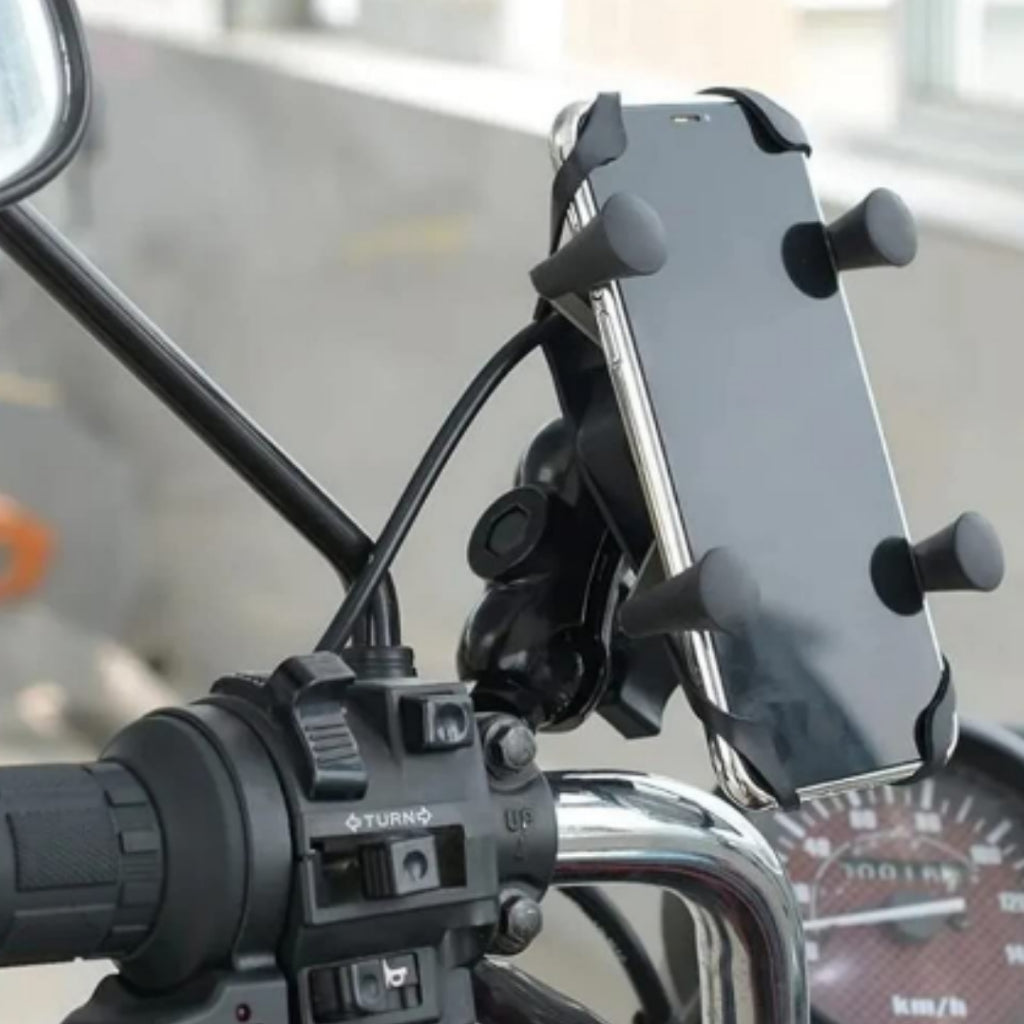 O suporte de celular para motos tipo universal com carregador USB turbo é ideal para quem precisa utilizar o GPS durante a pilotagem ou ficar atento às notificações no celular.Ele é instalado no retrovisor e o cabo do carregador é ligado na bateria da motocicleta de forma super rápida e prática. Possui botão liga e desliga para não descarregar sua bateria.Tem fixação tipo garra em X super firme com borrachas nas pontas que garante segurança para o seu celular, além de contar com um elástico que deixa o celular ainda mais firme.Compatível com todos os modelos de motos e celulares, possui duas articulações para melhor posicionamento do produto.Benefícios:* serve em todos os modelos de motos* com carregador usb turbo* fixação firme e segura* elástico de segurança* borrachas de proteção reserva* instalação fácil e prática* botão liga / desliga para não gastar a bateria da motoInformações técnicas:* Suporte Universal tipo garra aranha em X* Possui entrada USB à prova d’água* Carregador Turbo 5V***** CONTEÚDO NA EMBALAGEM *****- Suporte para celular GARANTIA DE 30 DIAS!!! PRODUTO COM NOTA FISCAL!!DESPACHAMOS NOSSAS VENDAS EM ATÉ 24 HORAS ÚTEIS APÓS A CONFIRMAÇÃO DO PAGAMENTO!!