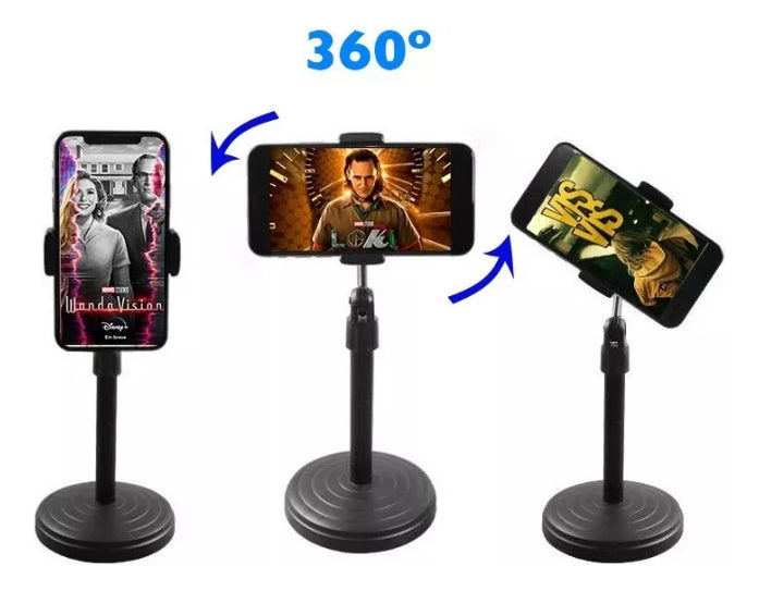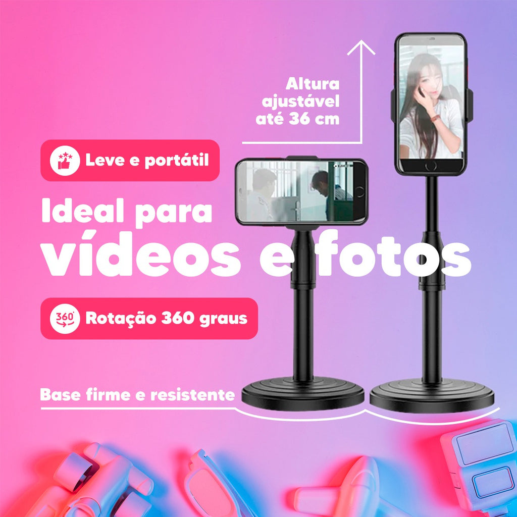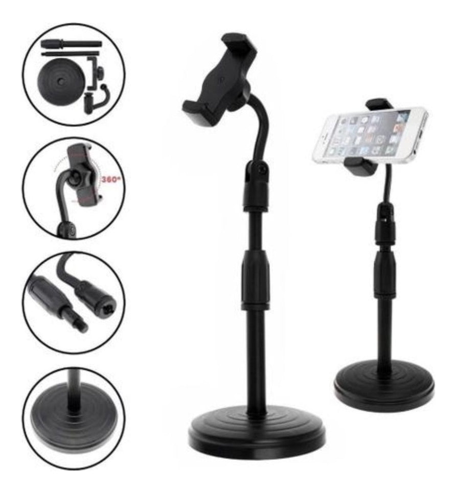 Apresentamos nosso suporte de mesa para celular, com uma base super resistente que garante firmeza durante o uso, eliminando o risco de quedas durante suas gravações, transmissões ao vivo, sessões de fotos ou mesmo quando estiver aproveitando suas séries e vídeos favoritos.Confeccionado em liga de alumínio, este suporte oferece alta resistência para suportar o ritmo do dia a dia, assegurando uma longa vida útil.Com ajuste de altura e inclinação de 360º, proporciona diversas opções de posicionamento, adaptando-se às suas necessidades com facilidade. Este produto de alta qualidade está disponível a um preço acessível.Itens inclusos na caixa:Base resistente em alumínio Haste com ajuste de altura em alumínio Suporte para celular com ajuste de inclinação e acabamento interno em borracha para proteção do aparelho.
