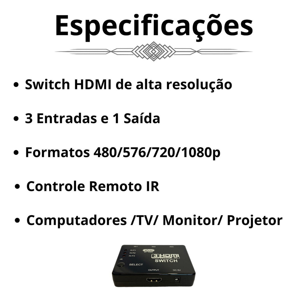Desbloqueie uma nova era de conectividade audiovisual com o Switch HDMI 3 em 1. Simplificando a maneira como você gerencia suas fontes de vídeo, este dispositivo inovador oferece uma solução elegante para seus desafios de conectividade. Comutando sem esforço entre diferentes dispositivos, você se livrará da confusão de cabos e desfrutará de uma configuração organizada.Não se trata apenas de conveniência, mas também de qualidade. Experimente resolução de vídeo deslumbrante e áudio imersivo, elevando sua experiência visual e sonora. Sua instalação descomplicada permite que você aproveite todos os benefícios rapidamente, sem complicações.Seja para entretenimento casual, sessões de jogos envolventes ou apresentações importantes, o Switch HDMI 3 em 1 garante que você esteja no controle total. Simplifique sua vida digital hoje mesmo com este dispositivo que combina perfeitamente praticidade e desempenho excepcional.Garantia do vendedor: 1 meses